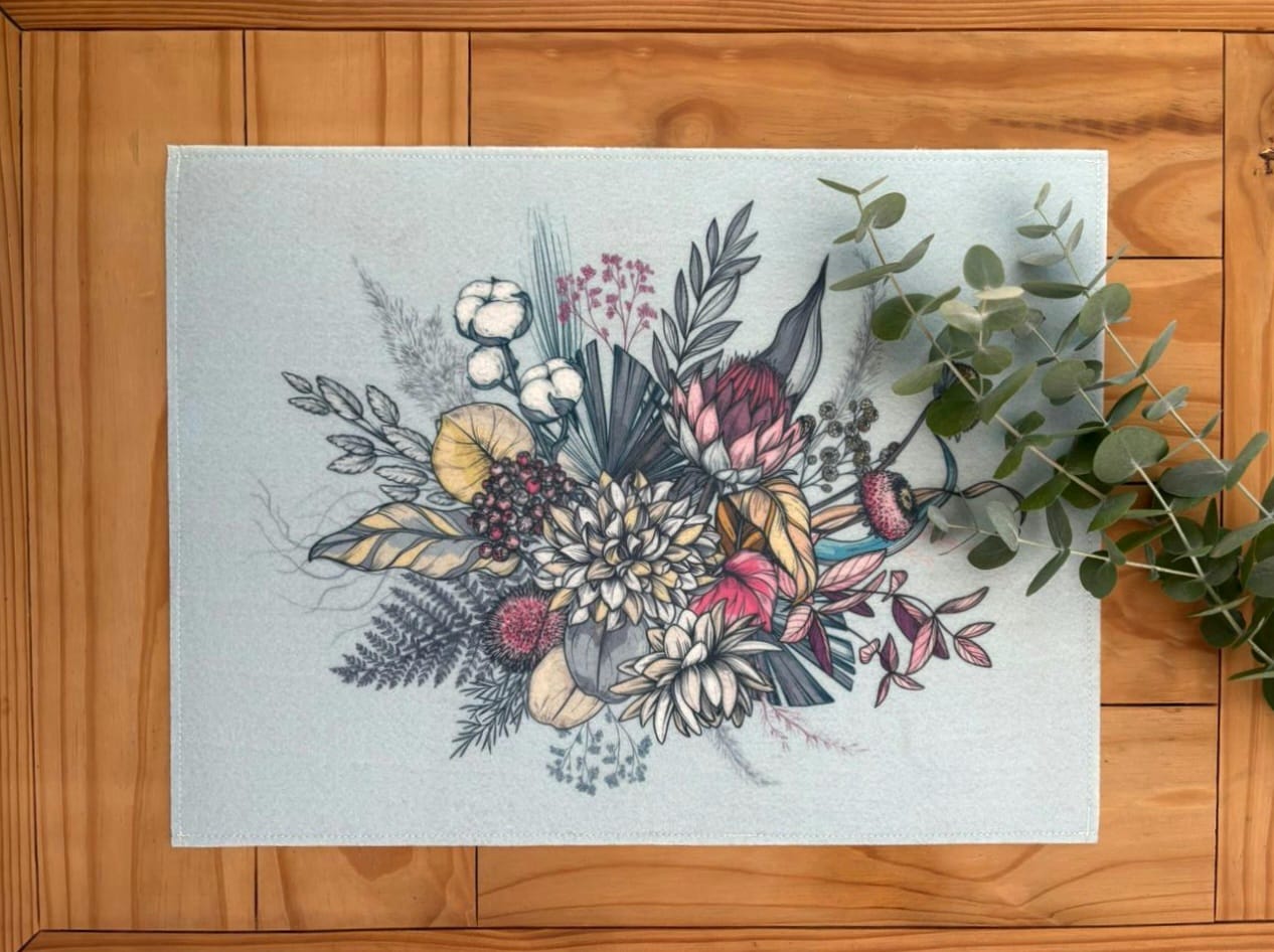 Delicate and serene, this soft floral print is striking on our soft recycled plastic felt placemats.