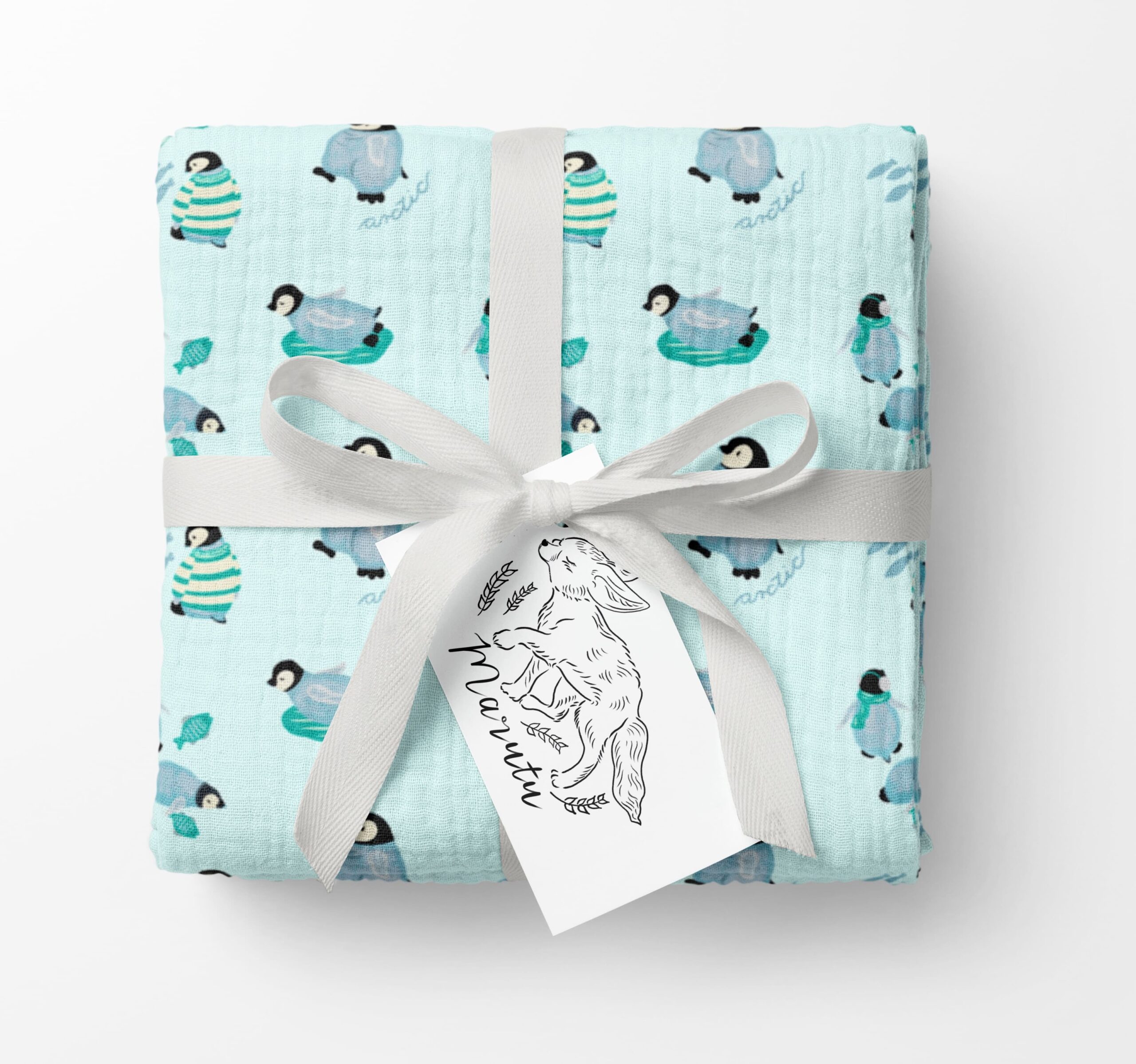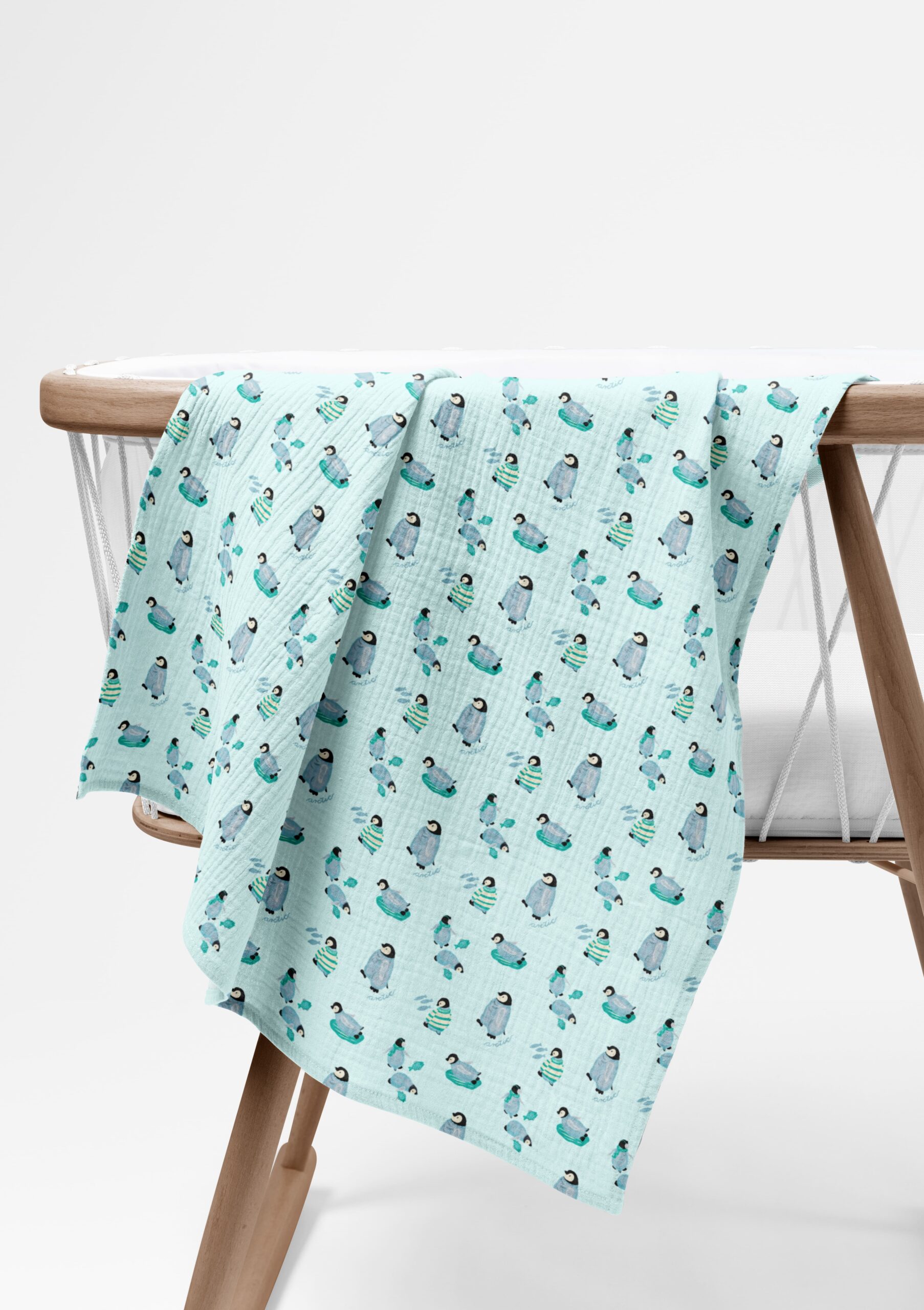 Cool but cozy, this muslin blanket features a waddling bunch of penguins – light enough for everyday use, warm enough for sweet dreams.