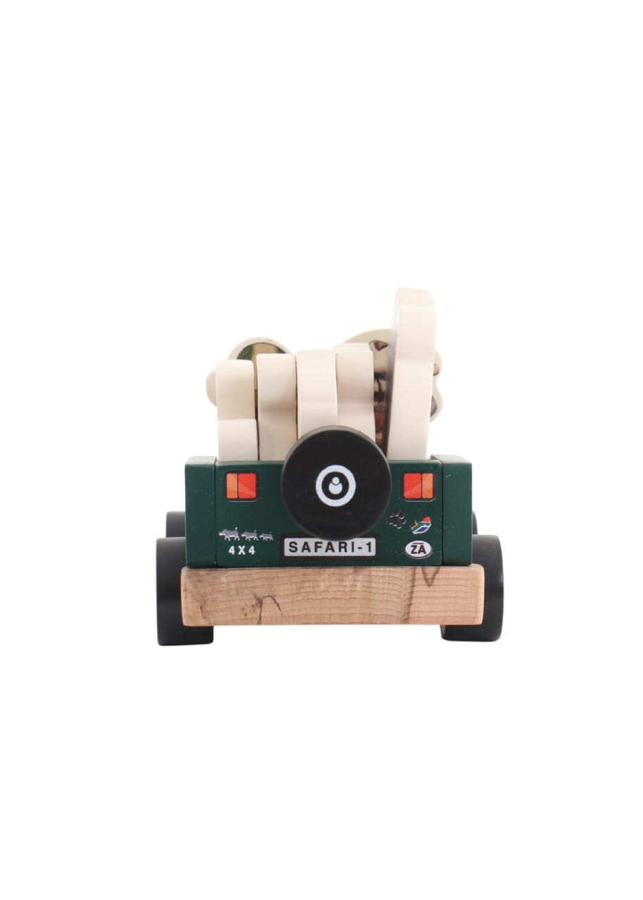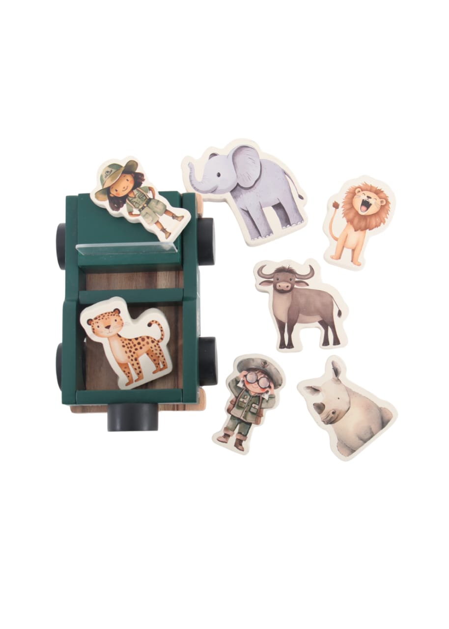 Safari vehicle & characters: Two explorers—one driving, one spotting wildlife—bring the adventure to life.