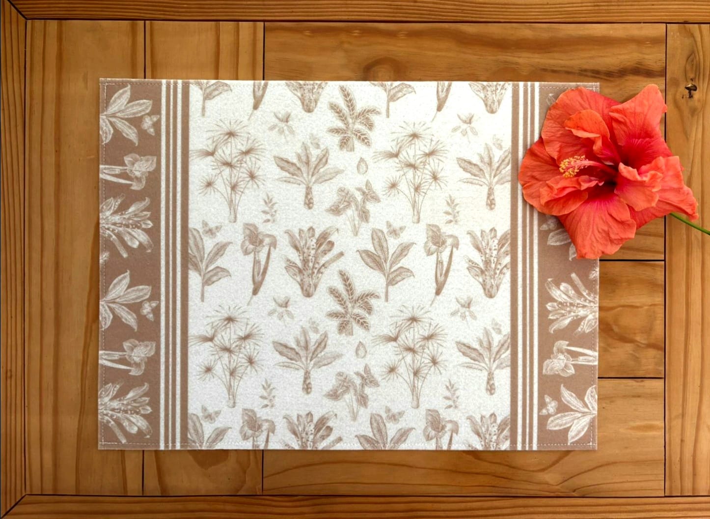 Elevate your dining table with earthy caramel tones and tropical motifs. Crafted from premium recycled plastic felt for a truly refined dining experience.